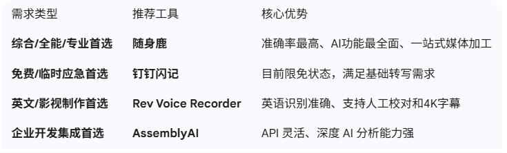 对于已深度使用钉钉的用户,钉钉闪记的限免政策提供了零成本的入门方案;而Rev Voice Recorder和AssemblyAI则分别在英文内容生产和企业定制开发领域有着自己的独特优势。