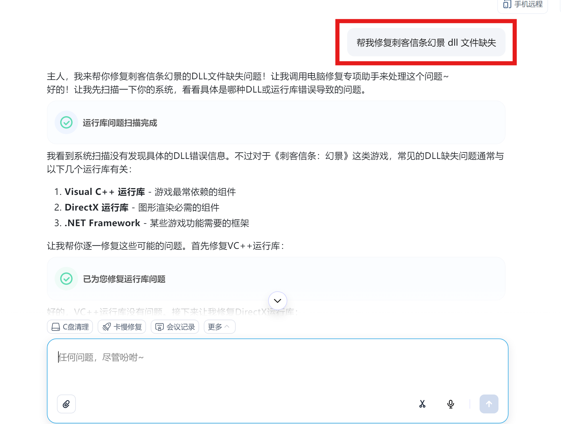 使用元气AI Bot修复刺客信条幻景 dll 文件缺失的步骤如下: