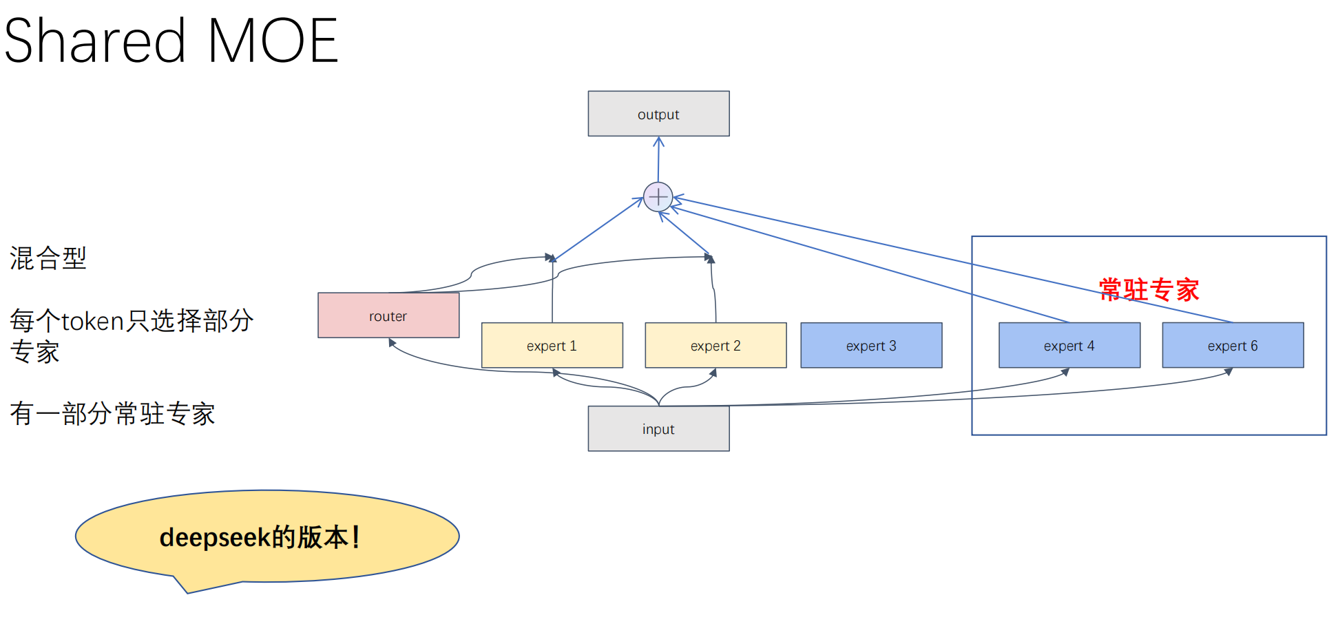 共享专家 (Shared Experts):剥离出永远激活的专家处理标点、基础语法等“通用知识”,让其他专家专心钻研复杂知识,彻底避免了“专家坍塌”。