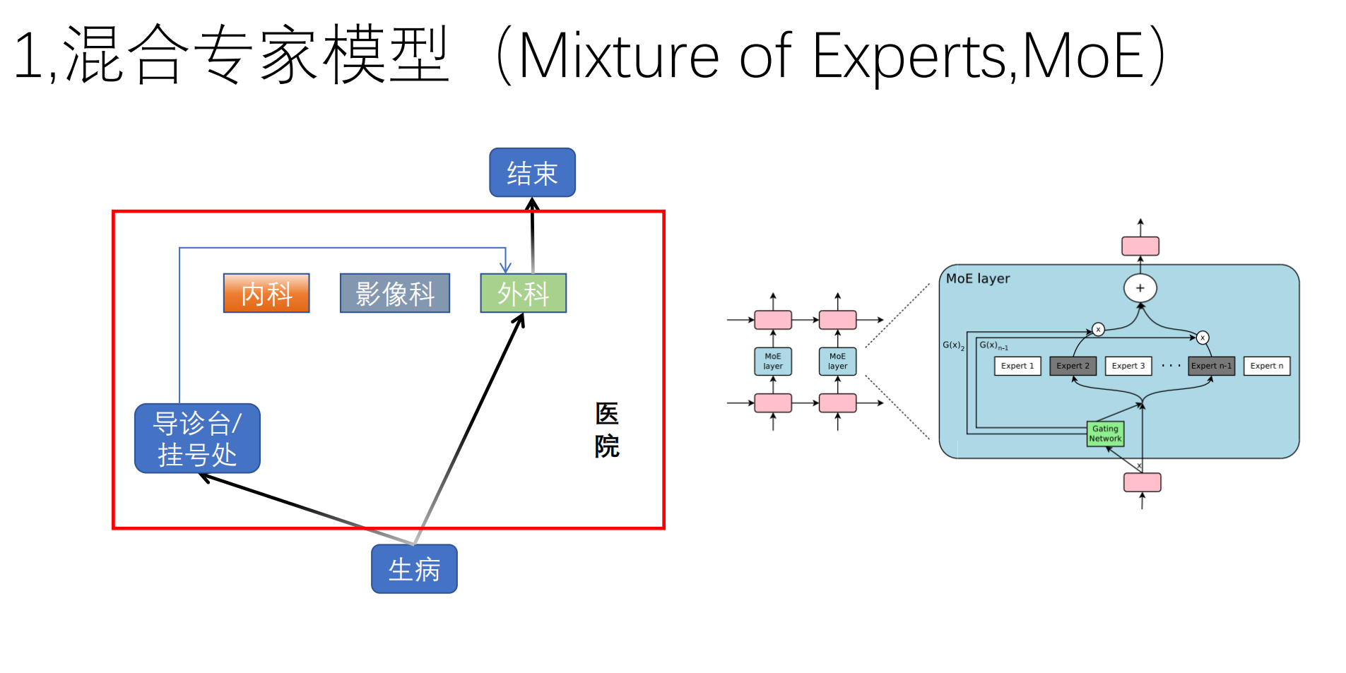 MoE(混合专家模型):将庞大的网络拆分成多个“专家”。借助 Router(路由) 动态激活最合适的几个专家(如只激活 8/64)。