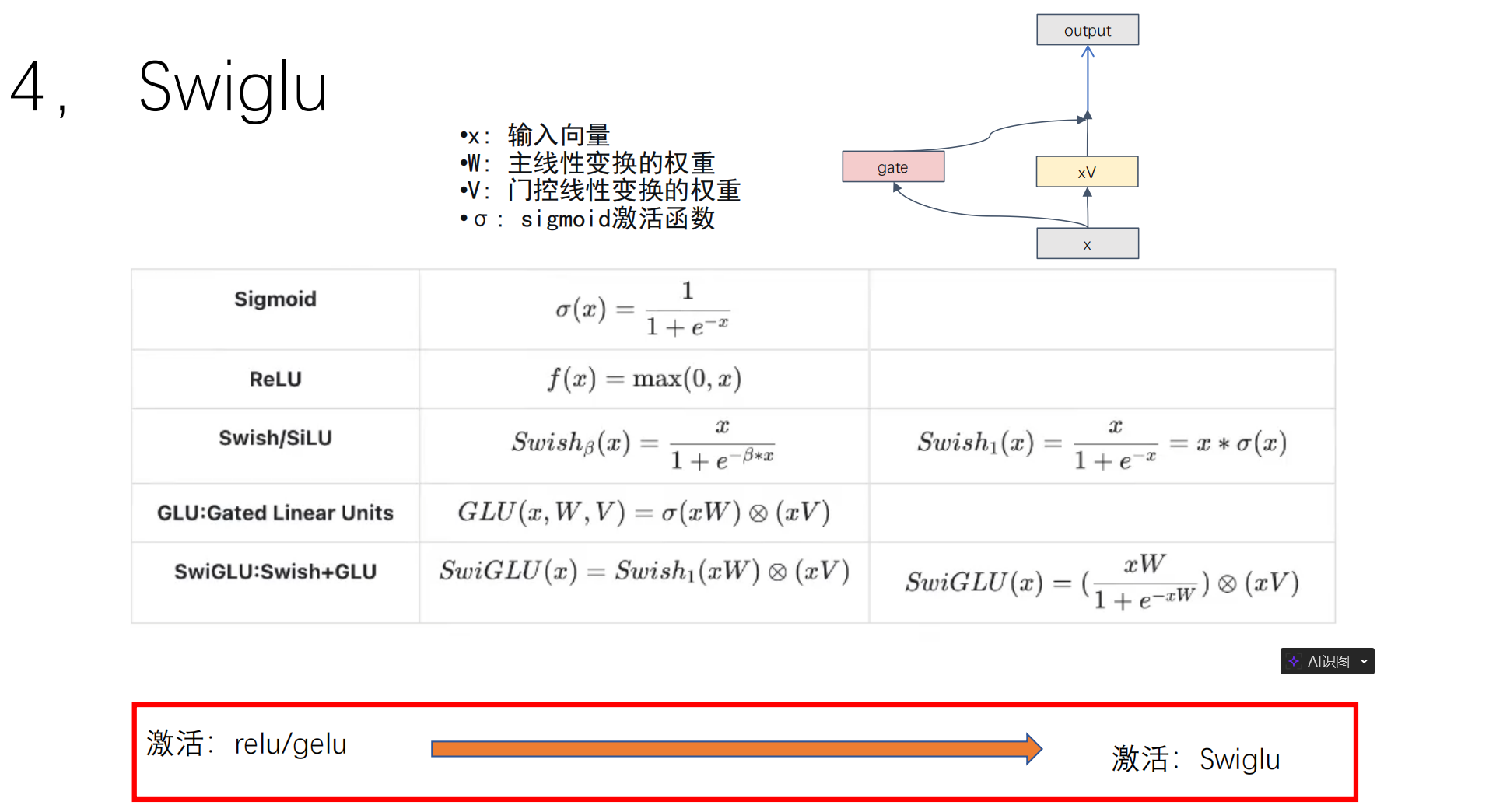 2.2 激活函数演进:ReLU/GELU --> SwiGLU