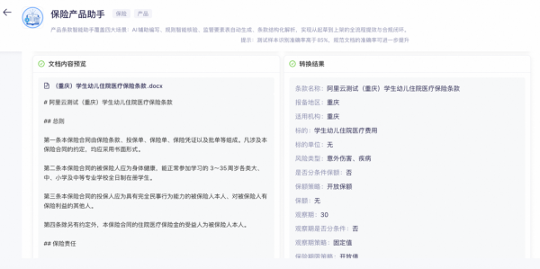 从直播演示中可以看到,在使用阿里云智能保险产品助手进行条款结构化解读时,在上传保险产品条款后,稍许等待,就可以按照保司要求将所有字段通过大模型完全解读出来,并通相应参数匹配到系统中,就完成了整个保险产品的闭环设计。