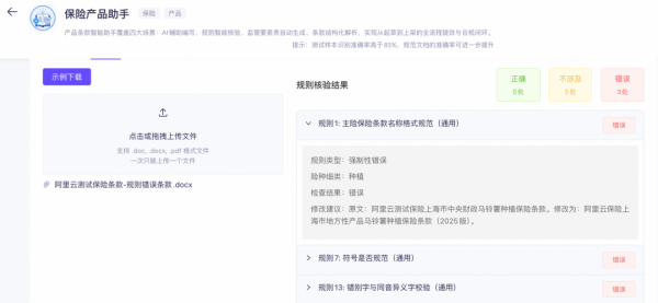 在使用阿里云智能保险产品助手进行条款规则校验时,上传了标的、文本、数据、段落等存在错误的保险产品条款后,稍许等待,就可以识别出条款中不规范的符号(例如中英文符号混用)、错别字、不涉及的规则进行了准确无误的识别。