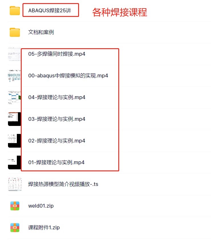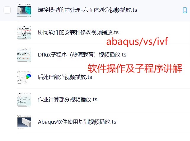 abaqus焊接仿真培训资料,含热源模型,子程序 焊接应力应变场及其数值模拟理论简介 热力耦合理论(热应力分析) 协同软件的安装和修改、Abaqus软件使用基础 焊接模型的前处理部分Dflux子程序(热源载荷) 作业计算部分 、后处理部分 、平板对接接头单道焊算例(完全耦合)、T型接头单道焊算例(顺序耦合) 、平板对接接头生死单元算例 、平板对接接头多道焊算例 、平板多焊缝焊接算例 、平板多焊缝同时焊接算例、搅拌摩擦焊算例(热源移动法)复合热源焊接算例、固有应变法的原理及仿真实例