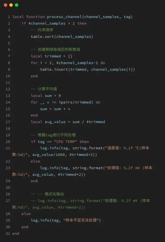 当通道样本数大于2时,先对样本升序排序并剔除首尾极值,计算剩余样本的平均值,最后根据标签(如CPU温度或电压)格式化输出带单位的处理值及总样本数,否则记录样本不足。