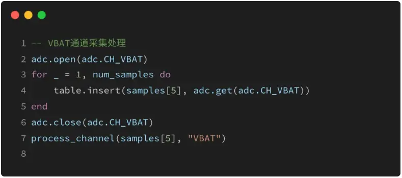 通过adc.get(id)读取4个普通ADC接口的外部输入模拟电压;首先设置量程,然后打开ADC通道0,进行采样循环,将获取到的输入模拟电压值存入数组,接下来关闭ADC通道0,最后进行数据处理、打印。