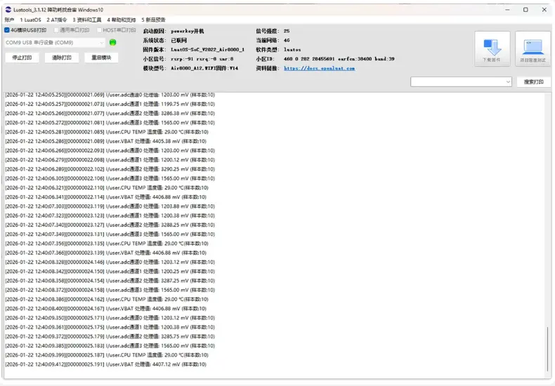 参考实操教程搭建好硬件环境,使用Luatools工具给Air8000开发板烧录相关内核固件和demo脚本代码。烧录成功后,自动开机运行。