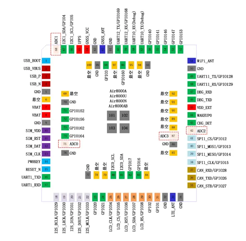 以Air8000A工业引擎为例,提供了丰富且实用的ADC资源,可满足大多数物联网应用需求。