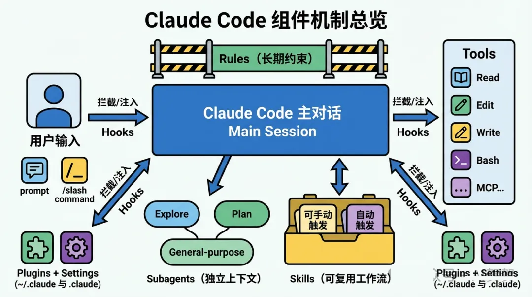 - rules(规则):限制/规范助手行为,避免跑偏(例如禁止某些危险操作、要求先读代码再改等),claude code自动识别。
