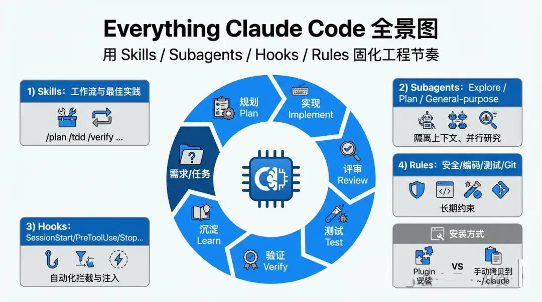 2)把“怎么用 Claude Code”固化为流程:通过 rules + commands + hooks,将“先计划(plan)/先测试(tdd)/再实现(写代码,claudecode自有能力)/再验证(verify)”的做事方式变成工具行为,而不是依赖使用者记忆。