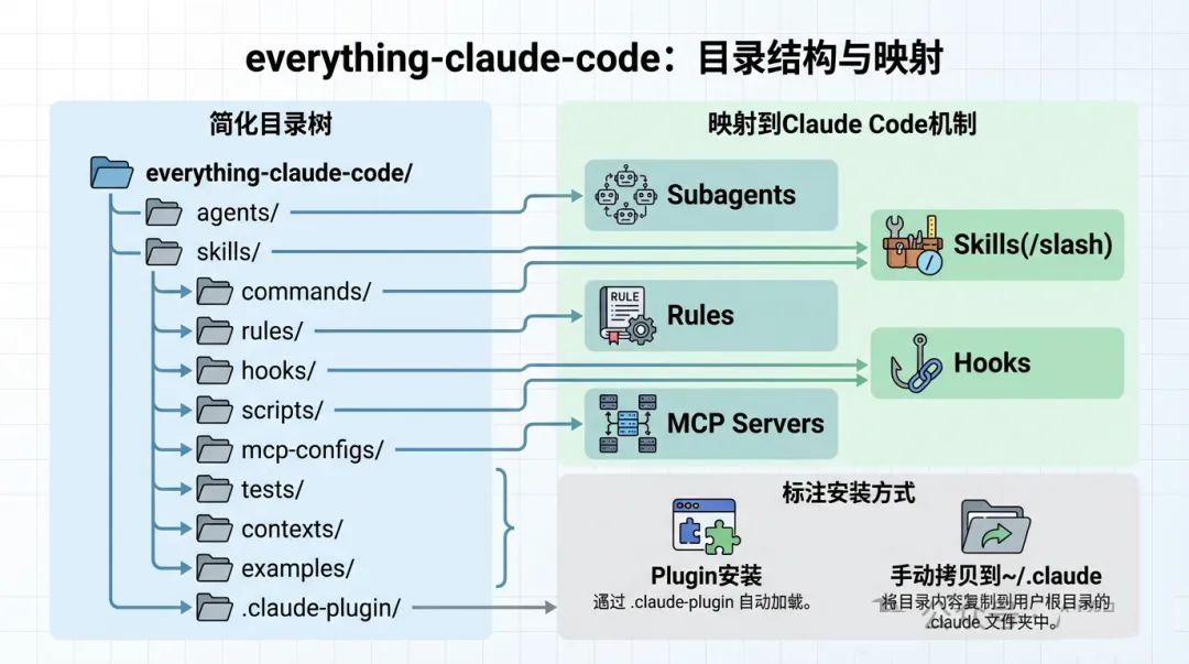 - 将 agents/ rules/ commands/ skills/ 拷贝到~/.claude/ 对应目录或项目根目录/.claude/里