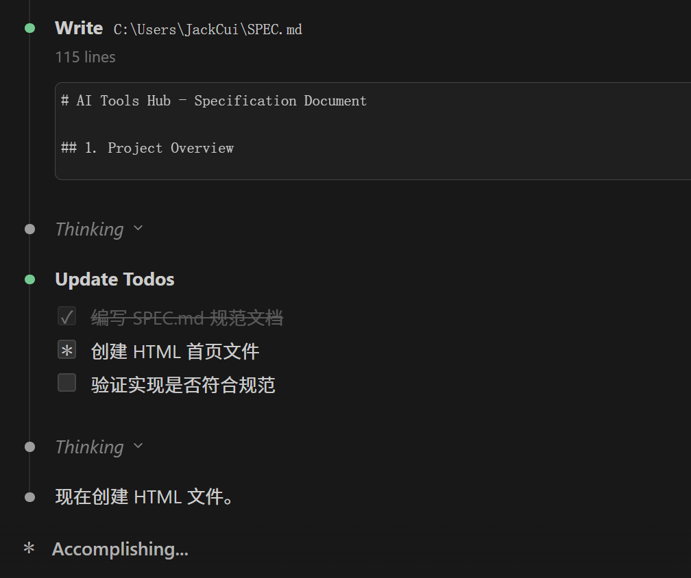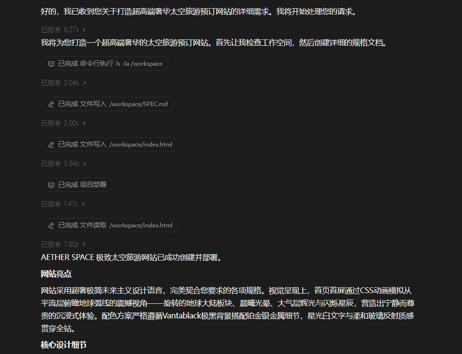 做网站的整个工作流不用你进行任何操作,AI 会自行网上搜索资料,写代码,运行代码,并部署好项目。