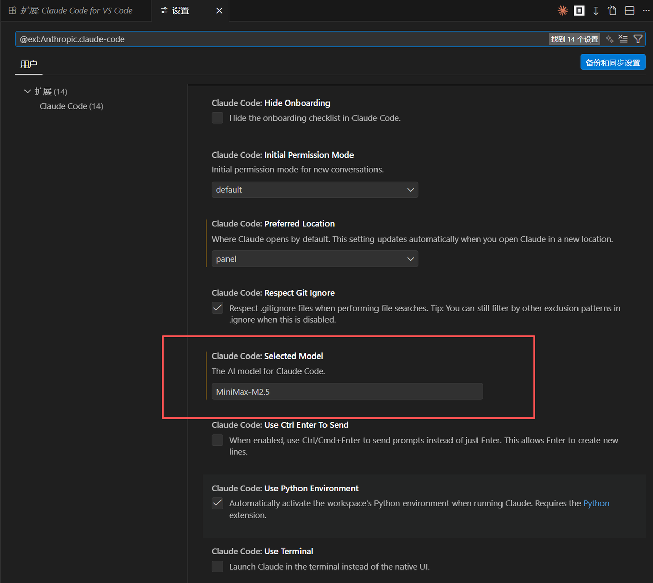 在 Selected Model 里,填写 MiniMax-M2.5。