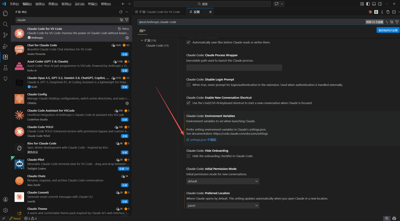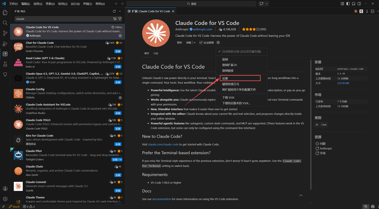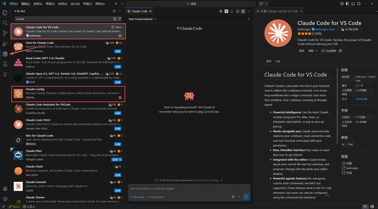 打开 VSCode 的应用市场,安装 Claude Code for VS Code 和 Cluade Config。