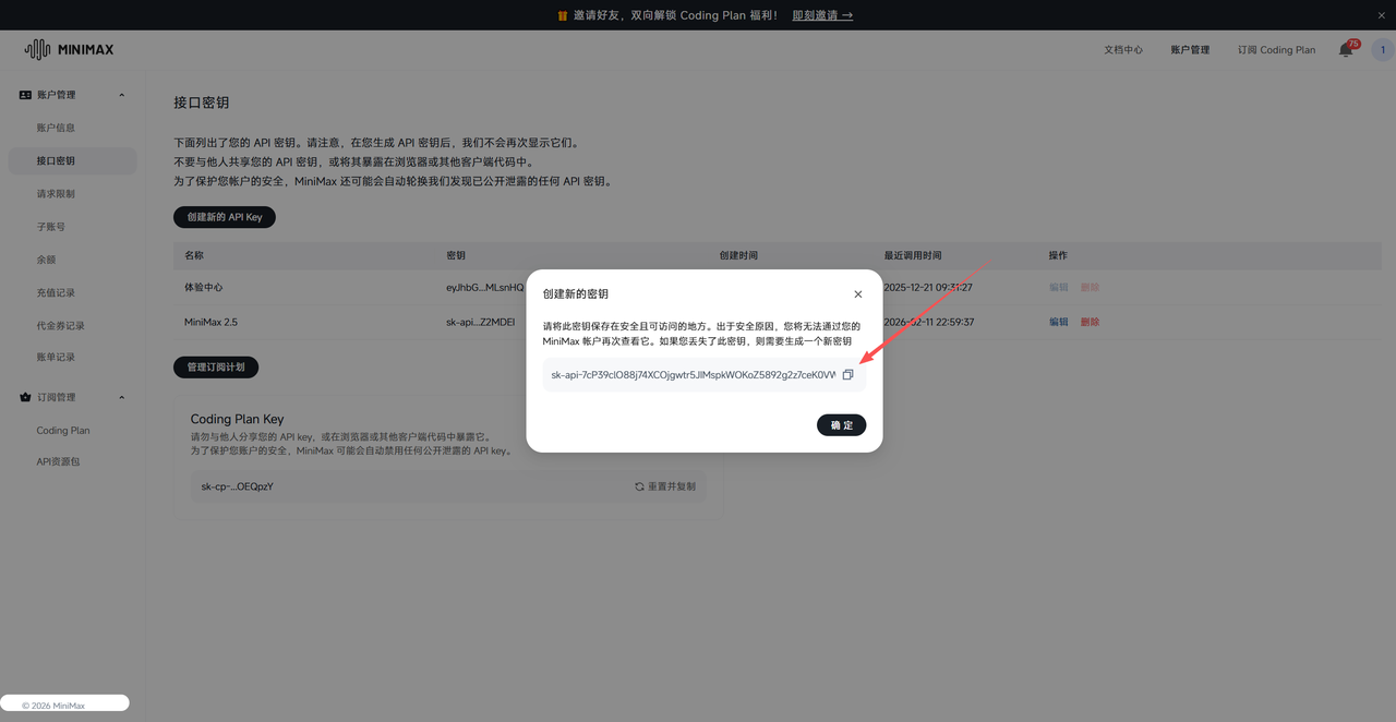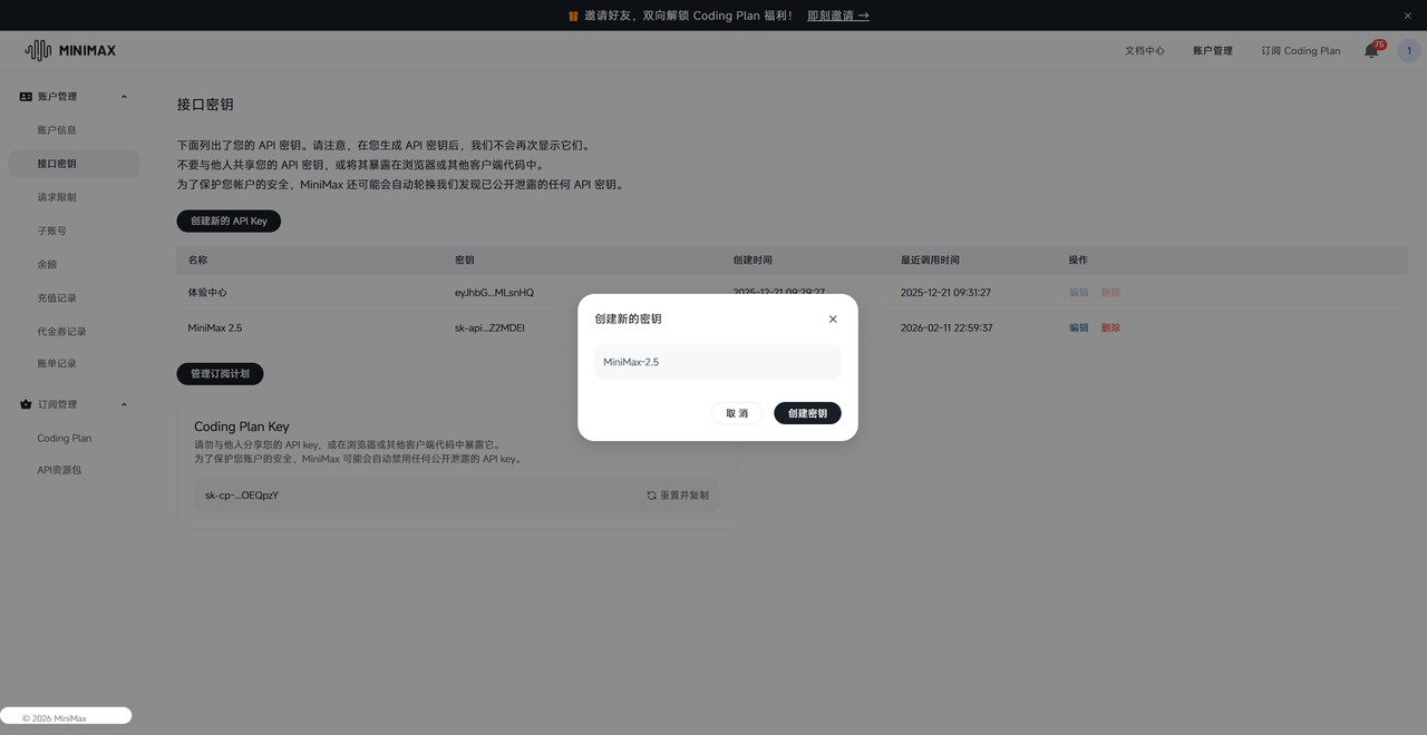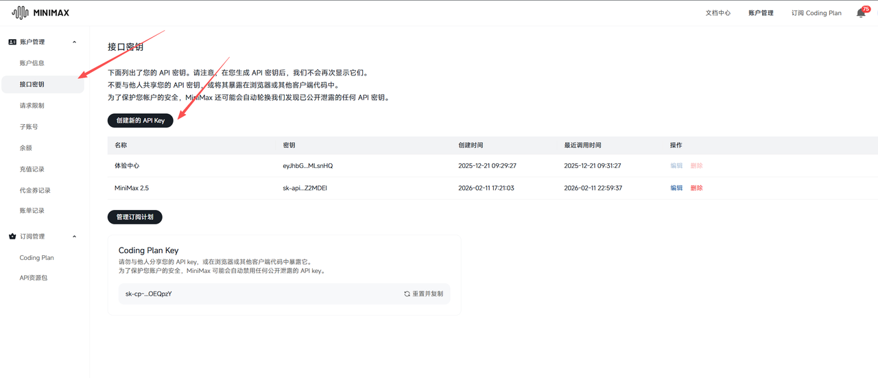 <MINIMAX_API_KEY> 需要修改,来到 MiniMax API 后台:
