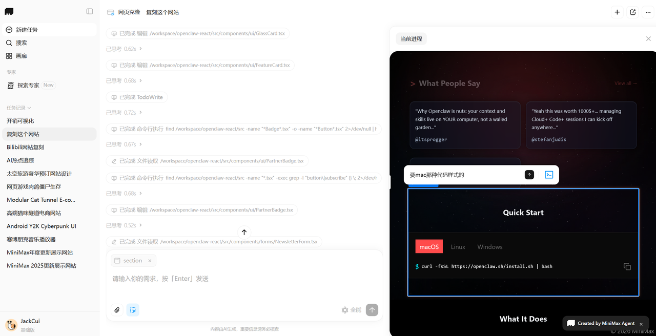 我直接用 MiniMax-M2.5,先克隆一个网站热热身。