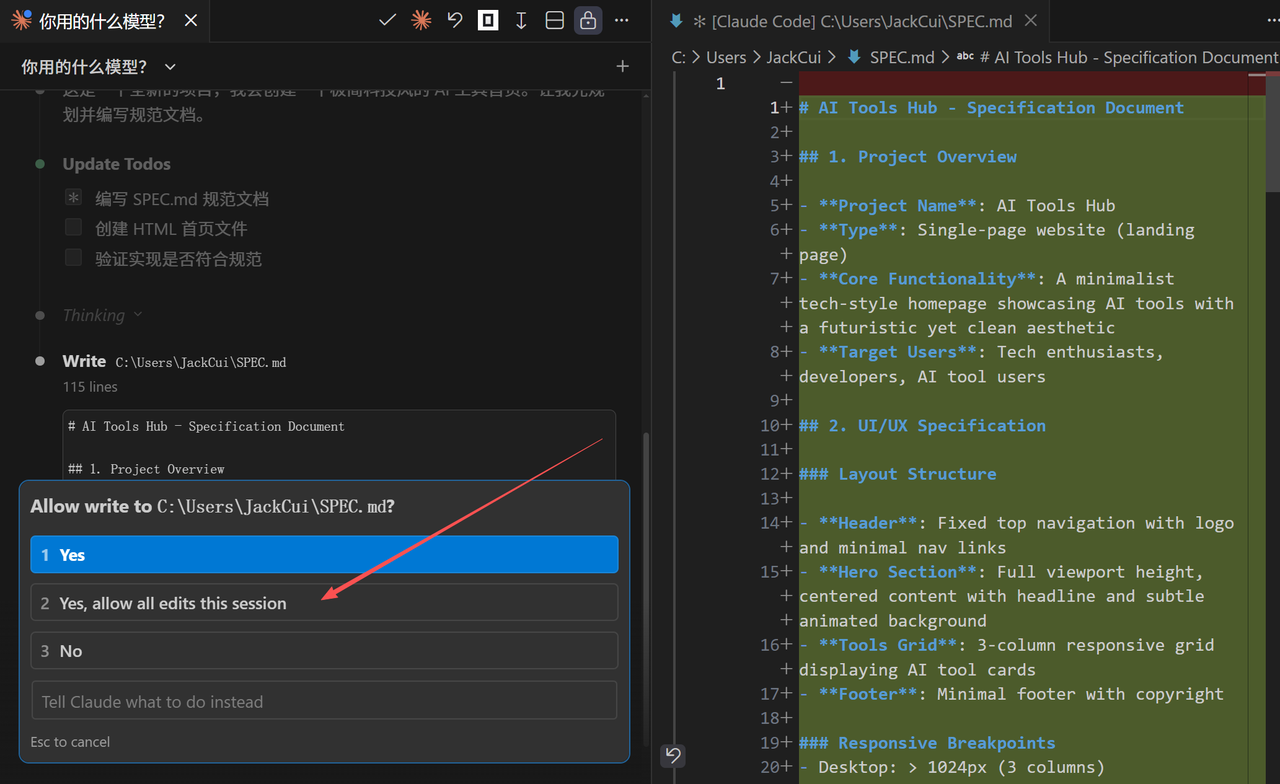 使用 Vibe Coding 是在本地生成文件,需要授权是否可以写入,可以选择这个 Session 对话下,都是允许的。