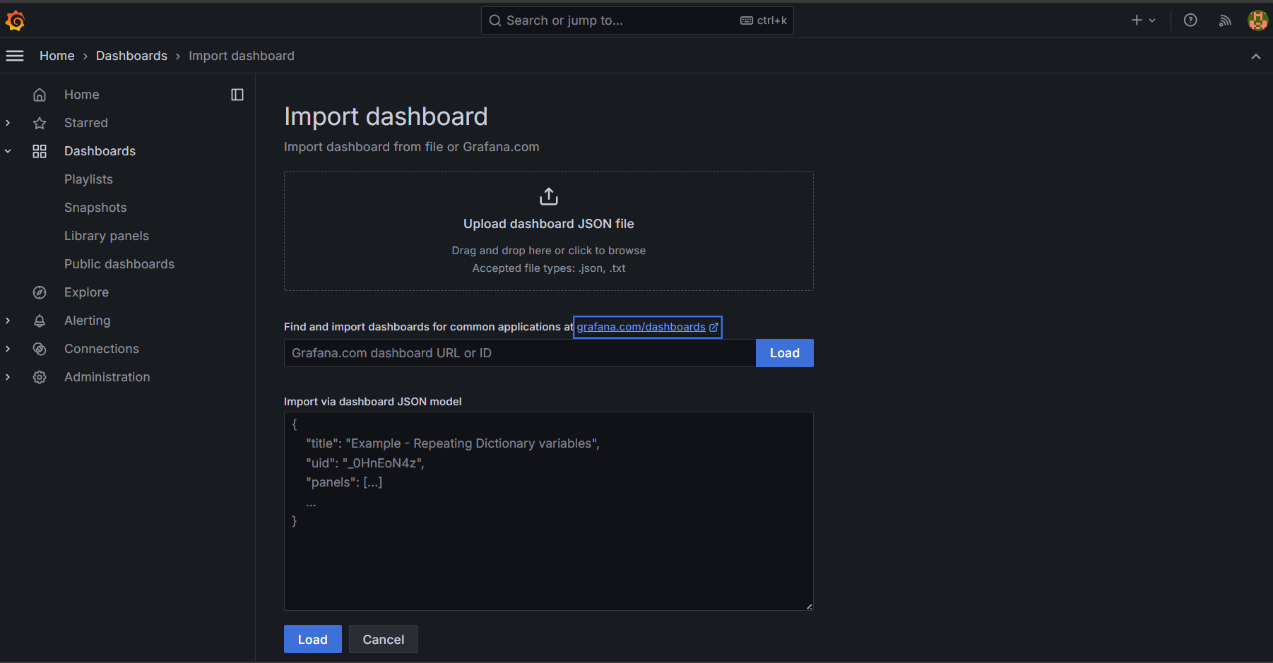 我们切换到Grafana页面,点击DashBoard,再点击右上角的new,选择import
