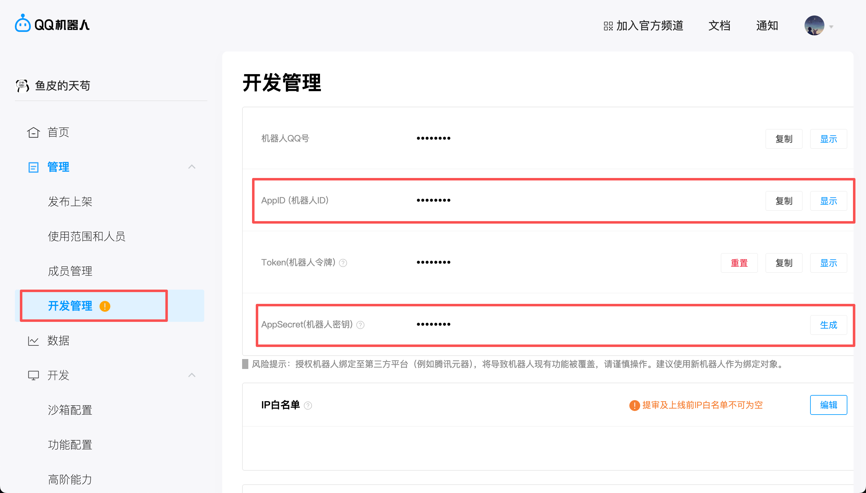 2)创建完成后,进入机器人的开发管理页面,找到 AppID 和 AppSecret,复制保存好,等会要用。