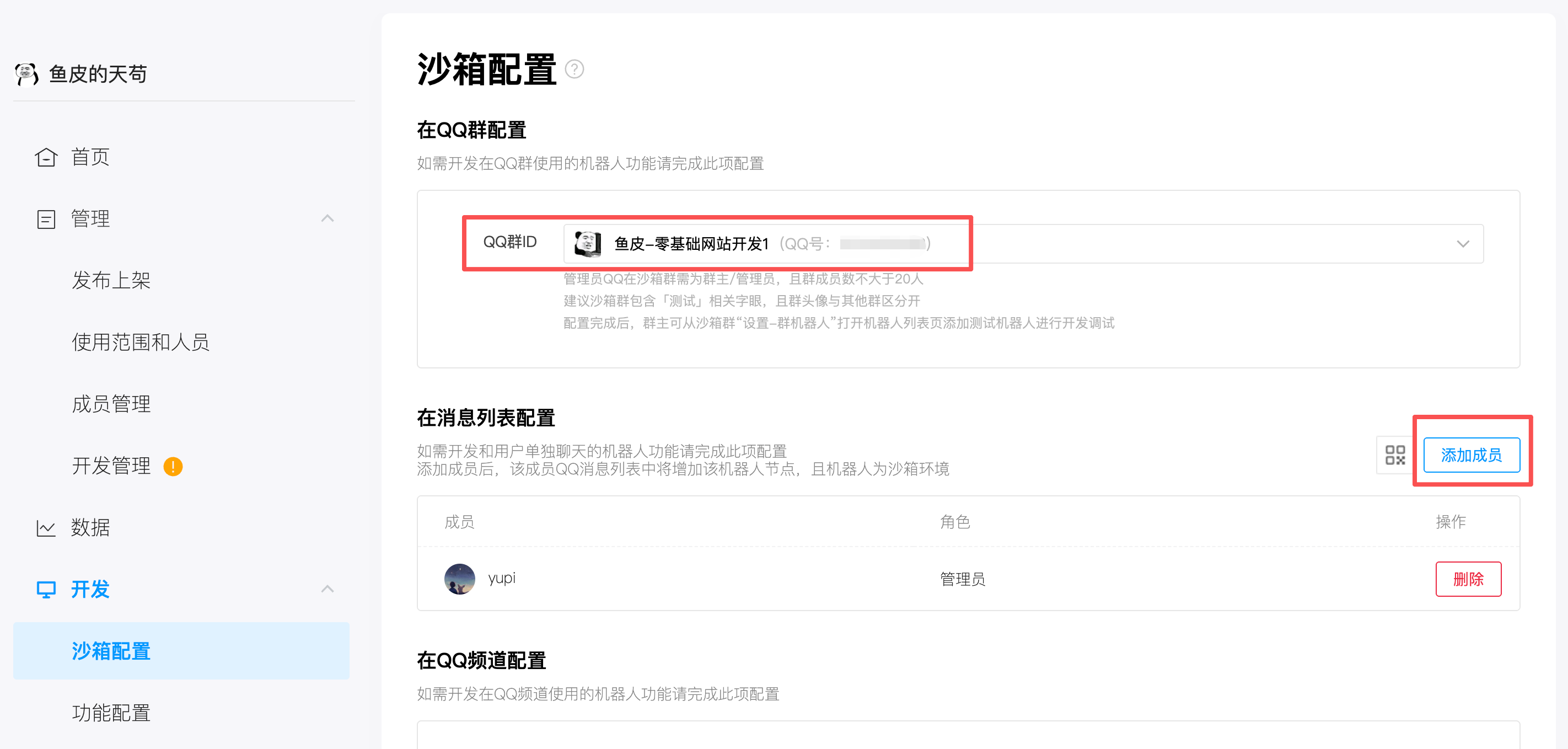 3)在沙箱配置里给你的 QQ 账号(或者 QQ 群)添加访问机器人的权限: