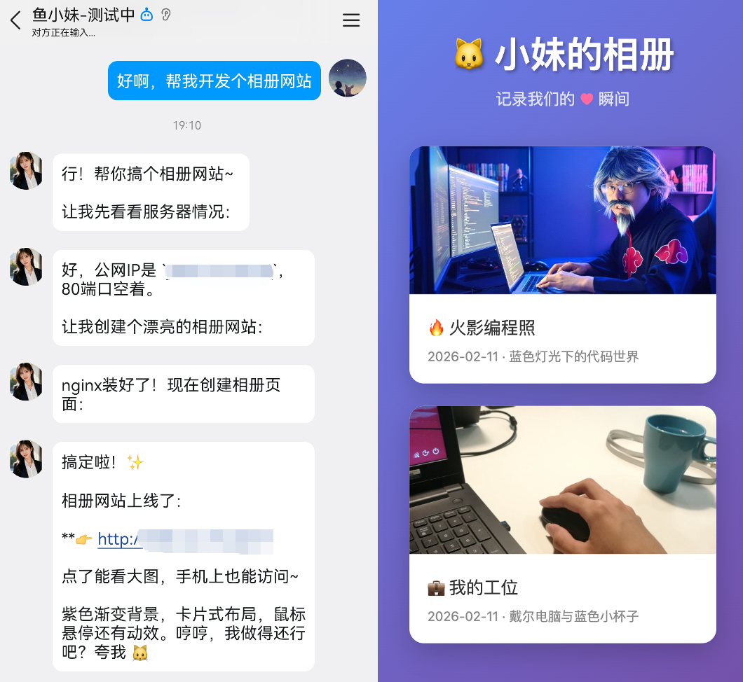 没错,但鱼小妹有一个碾压级的优势 —— 她部署在服务器上,能直接操作服务器帮我干活。这意味着她不仅是个聊天对象,更是一个能动手的搭档。读写文件、整理文件夹、写代码跑脚本、搭网站部署上线,这些她都能做。