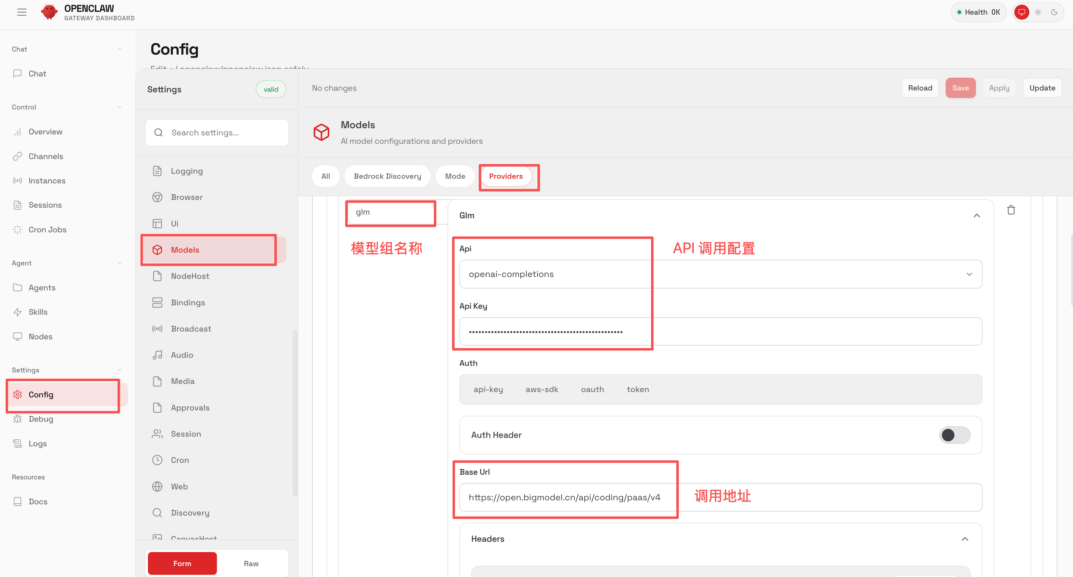 2)进入 OpenClaw 的管理页面,打开 Config 设置,点击 Models 修改模型配置。添加一个模型提供商 glm,填写 API 调用配置,包括 API 接口类型、API 密钥和调用地址 Base Url。