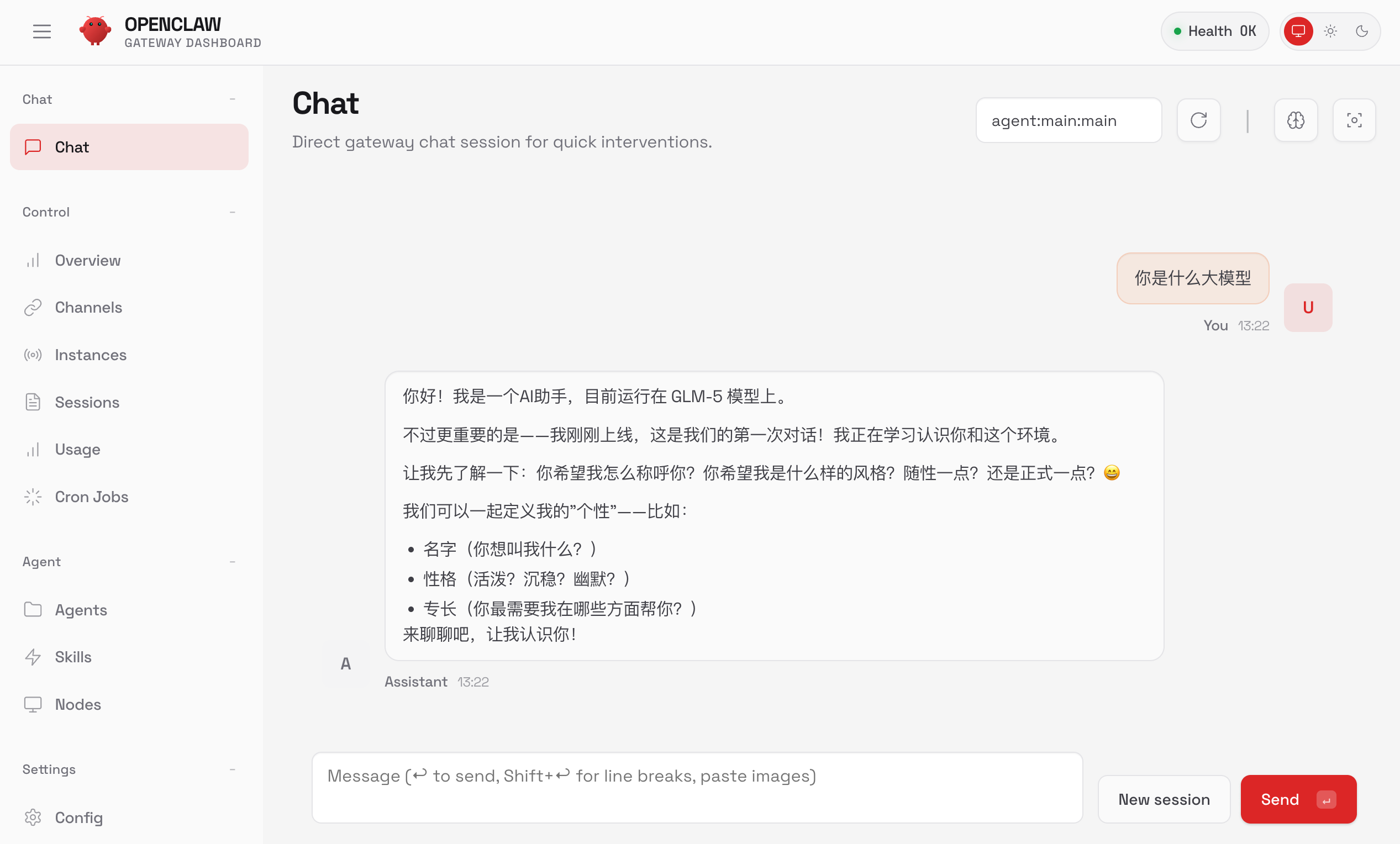 5)配置完成后,进入到 OpenClaw 的对话界面,和 AI 打个招呼,确认模型已经接入成功: