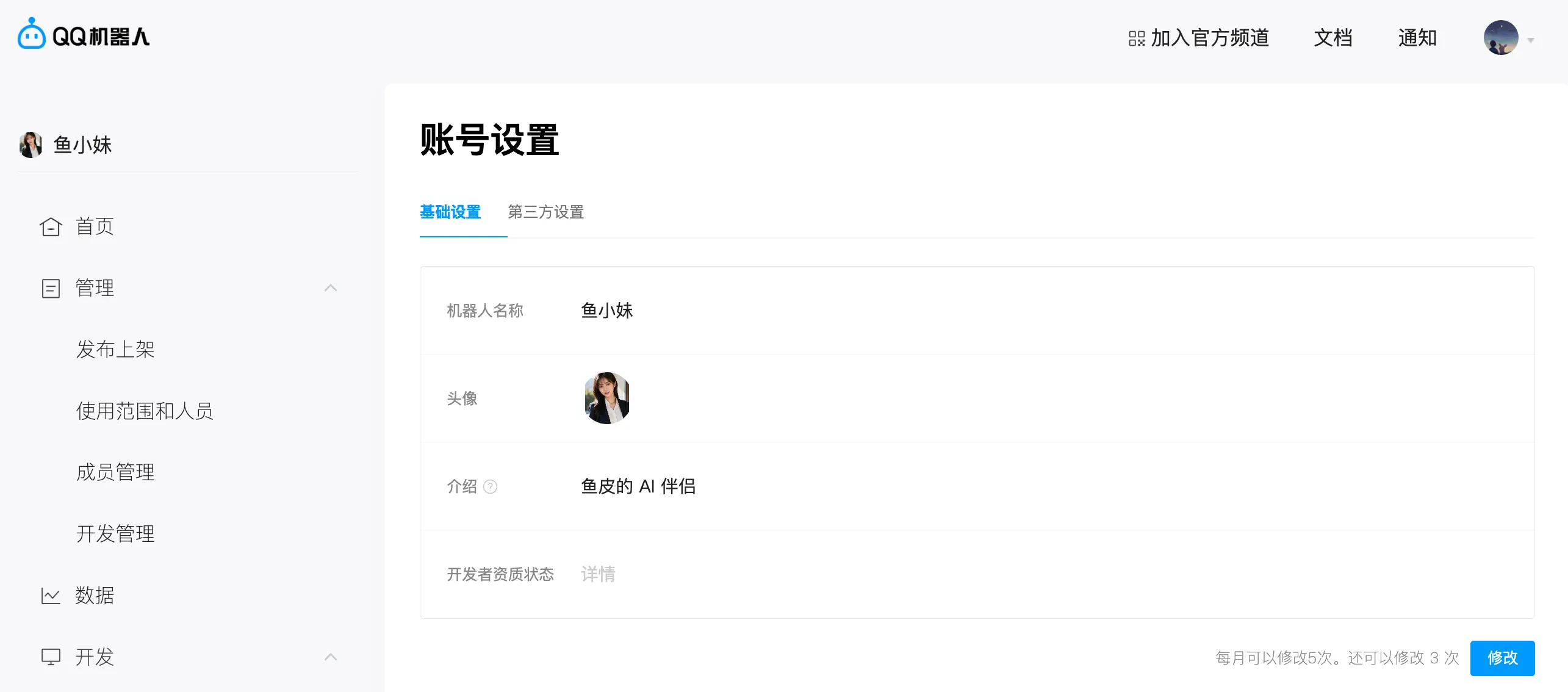 给机器人设置一个爱称和可爱的头像吧,便于之后在 QQ 中找到 Ta: