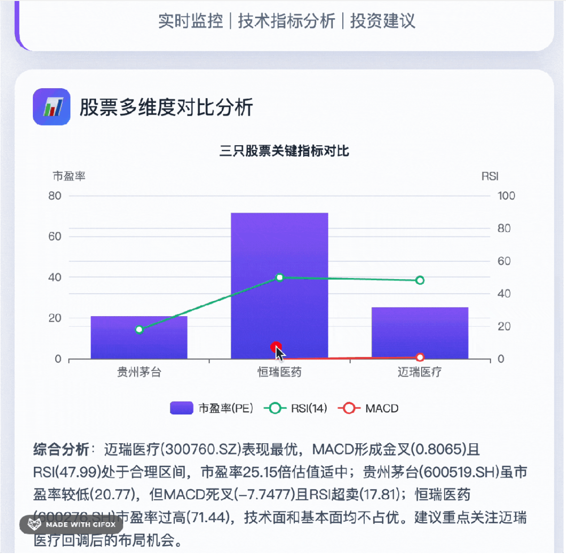 第三步,报告生成。完成数据筛选与指标计算后,AiPy开始生成量化分析报告。它首先确定了报告的结构,包括摘要、股票筛选结果、个股分析、仓位布局建议、风险提示等模块,然后将分析结果填充到相应模块中,并对数据进行可视化处理,生成了MACD和RSI指标的趋势图。最后,AiPy对整个报告进行了语言润色,确保内容专业、简洁,符合我们的要求。