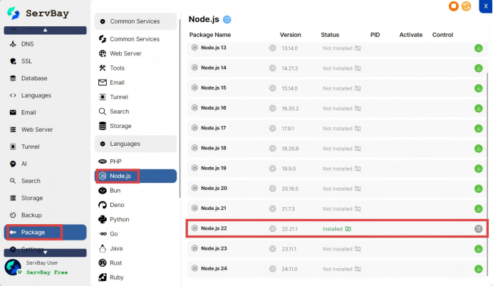 下载并安装 ServBay 后,在软件包管理中安装 Node.js 22 或更高版本。