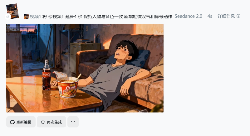 将 @视频1 延长 4 秒 保持人物与音色一致 新增轻微叹气和停顿动作