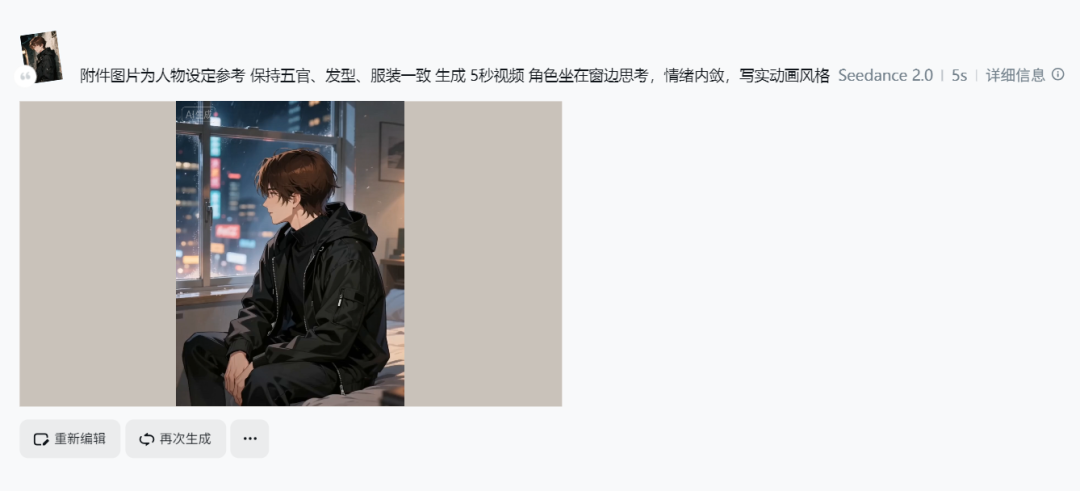 @图片1 为人物设定参考 保持五官、发型、服装一致 生成 20 秒视频 角色坐在窗边思考,情绪内敛,写实动画风格