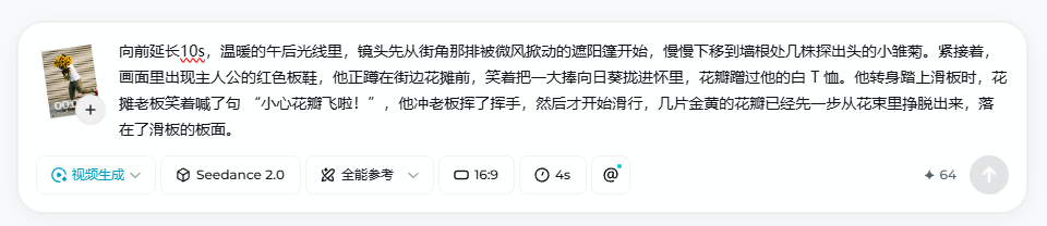 将 @视频1 向前延长 10 秒 保持人物和音色一致 镜头先从街角那排被微风掀动的遮阳篷开始,慢慢下移到墙根处几株探出头的小雏菊。紧接着,画面里出现主人公的红色板鞋,他正蹲在街边花摊前,笑着把一大捧向日葵拢进怀里,花瓣蹭过他的白 T 恤。他转身踏上滑板时,花摊老板笑着喊了句 “小心花瓣飞啦!”,他冲老板挥了挥手,然后才开始滑行,几片金黄的花瓣已经先一步从花束里挣脱出来,落在了滑板的板面。