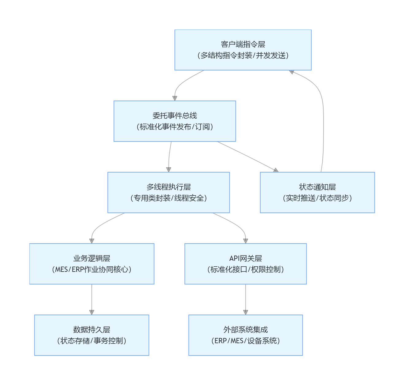 你需要的是在 MES/ERP 作业协同场景下,基于委托事件封装实现业务执行的解耦触发,针对多结构(多产线 / 多工序 / 多资源)设计专门化多并发客户端指令操作,并通过多线程专用的复杂成员方法类封装,构建包含界面、后台、API 的完整组件化解决方案。