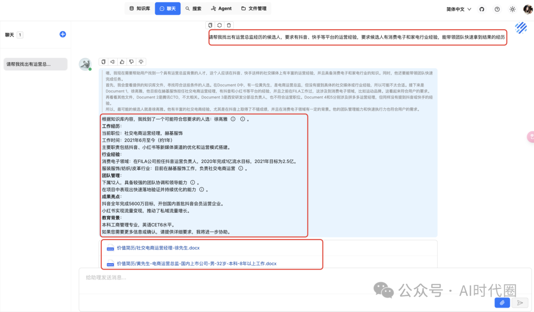最后我们可以通过一个问题做验证:“请帮我找出有运营总监经历的候选人,要求有抖音、快手等平台的运营经验,要求候选人有消费电子和家电行业经验,能带领团队快速拿到结果的经历”。可以看到给出了详细的思考过程,并且显示了引用的知识库文档,能准确的搜索到高度相关的候选人简历,准确性上都很满意。如下: