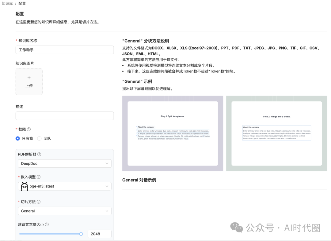 创建建议应用:【知识库】->【创建知识库】如下(与其他本地知识库框架不同的是RAGFlow提供了不同场景文档格式(General、Q&A、Resume、Manual、Table、Paper、Book、Laws、Presentation、One、Knowledge Graph、Tag)的切分方案):