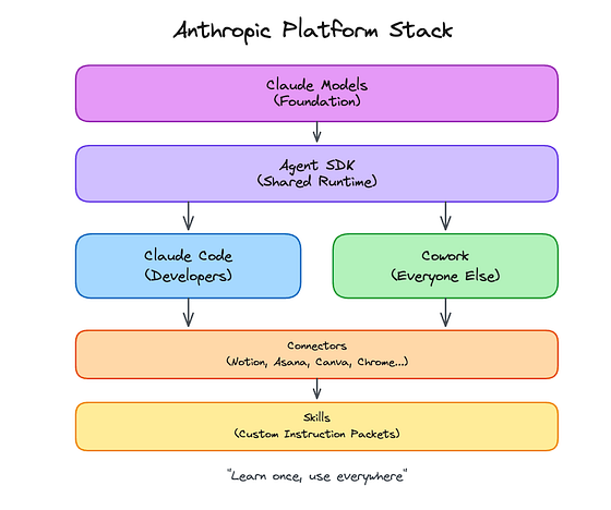 Anthropic不仅仅是在民主化Claude Code。他们正在构建一个平台策略。相同的Agent SDK。相同的第三方应用程序连接器框架。相同的技能系统。如果你投入时间学习这种架构,这些知识会在开发者和非开发者工作流程中复合。