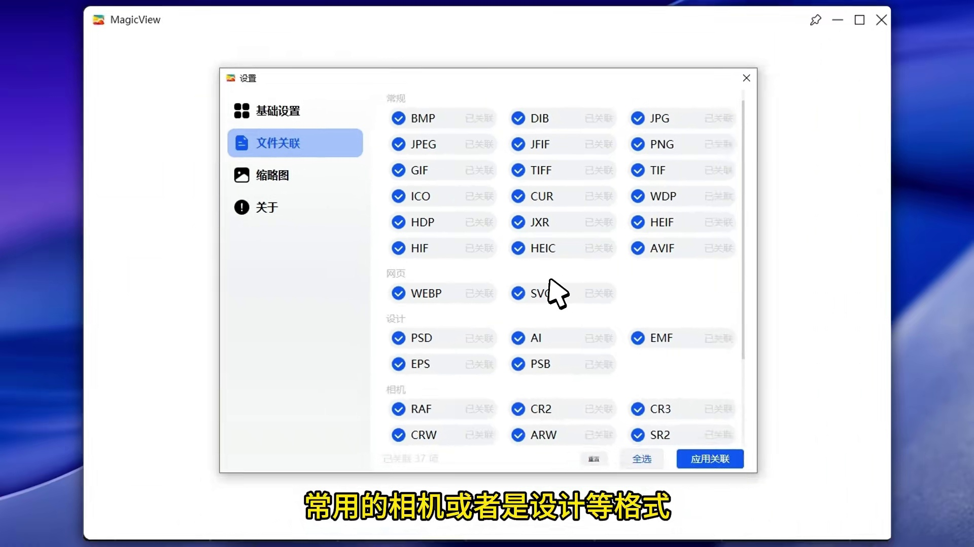 左侧选择“文件关联”:点击右下角“全选” → “应用关联”。这一步是为了让MagicView成为所有图片格式的默认打开方式。