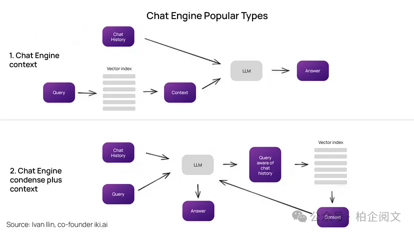 - 一种流行且相对简单的是ContextChatEngine,它首先检索与用户查询相关的上下文,然后将其与内存缓冲区中的聊天历史一起发送给大语言模型,以便大语言模型在生成下一个答案时能够了解先前的上下文。