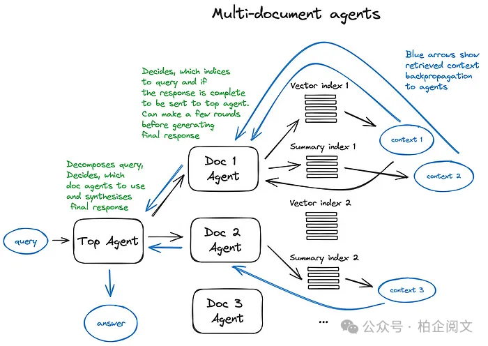 说明多文档智能体的方案,涉及查询路由和智能体行为模式