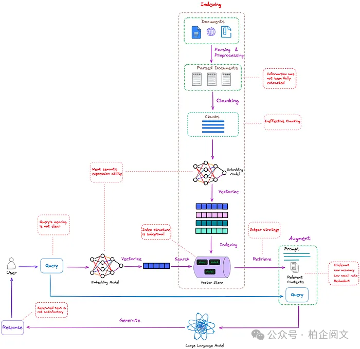 如上图所示,基础RAG在上述所有三个步骤中都存在问题(红色虚线框),有很大的优化空间。