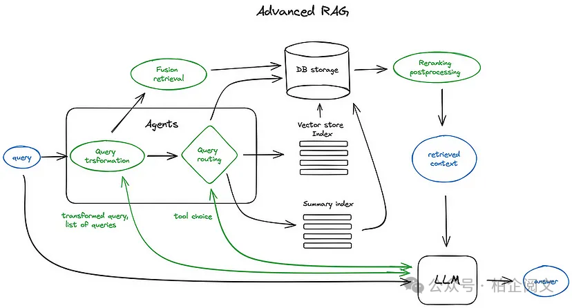 示意图中的绿色元素是我们将进一步讨论的核心RAG技术,蓝色元素是文本。并非所有的高级RAG理念都能在一个示意图中轻松呈现,例如,各种扩展上下文的方法就被省略了——我们将在后续内容中深入探讨。