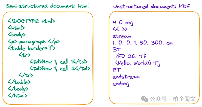 与其说PDF是一种数据格式,不如更准确地将其描述为一组打印指令。一个PDF文件由一系列指令组成,这些指令告诉PDF阅读器或打印机在屏幕或纸张上的何处以及如何显示符号。这与HTML和docx等文件格式形成对比,后者使用诸如<p>、<w:p>、<table>和<w:tbl>等标签来组织不同的逻辑结构,如下图所示: