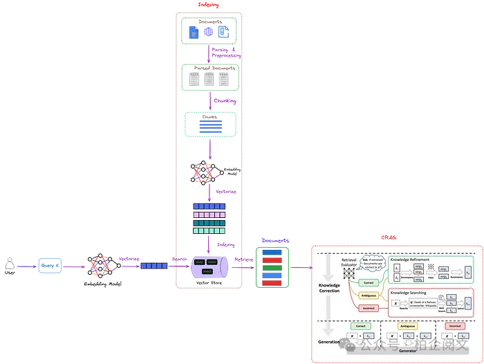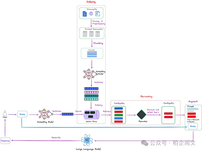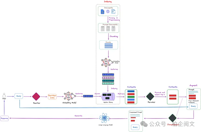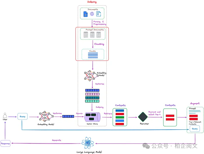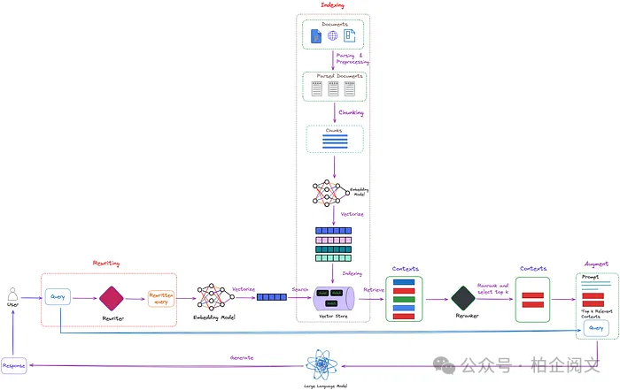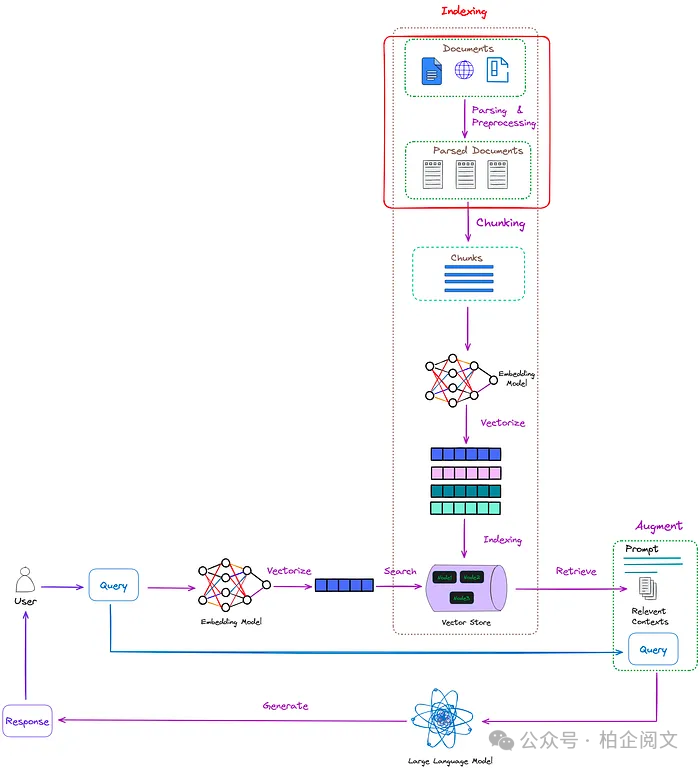 - 索引构建:文档被分割成块,编码为向量,并存储在向量数据库中。