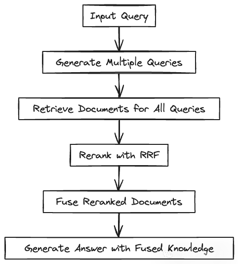 在文档检索之后,逆序排名融合(RRF)算法根据相关性对文档进行重新排序。然后将这些文档组合起来,形成一个全面且相关的信息源。