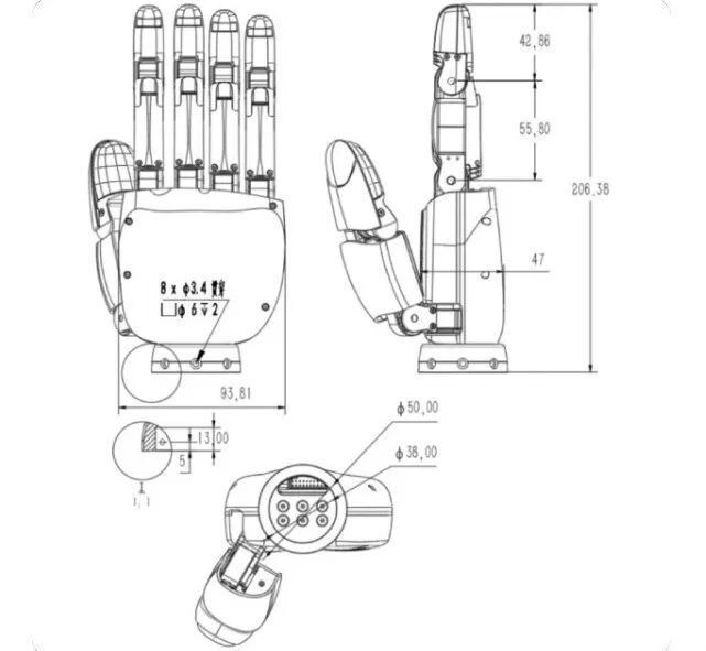 动力性能:单指最大负载可达5Kg以上,四指协同最大负载超20Kg,整手最大握力达80N,可轻松举起25Kg重物,响应速度快至每秒10次精准点击,媲美电竞选手手速;