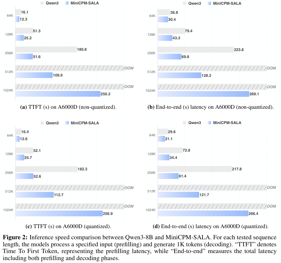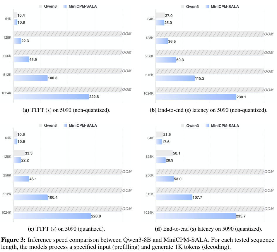 随着序列长度增加,MiniCPM-SALA在首字生成时间(TTFT)和端到端延迟上均大幅优于Qwen3-8B。Qwen3在512K长度时就因显存不足(OOM)而失败,而MiniCPM-SALA依然稳健运行。