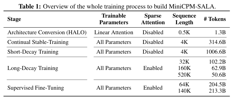 Table 1概括了构建MiniCPM-SALA的全过程。从架构转换到持续预训练,再到长文本适应和监督微调,整个过程环环相扣,高效利用了预训练权重。