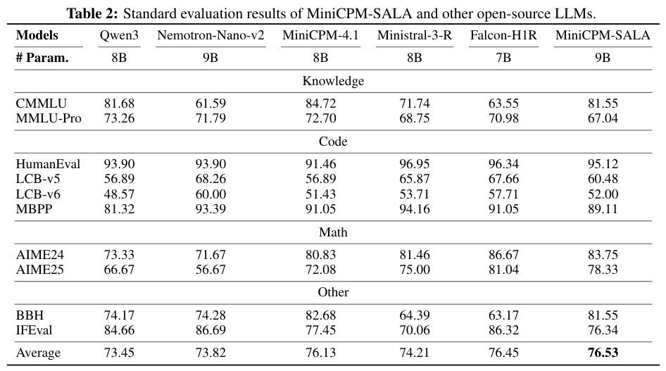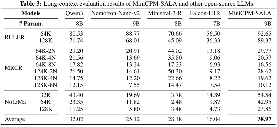 在常规短文本基准测试中,MiniCPM-SALA并没有因为引入了线性注意力而牺牲通用能力,其平均得分甚至略高于Qwen3-8B等强力基线。