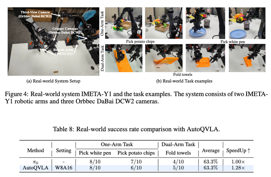 除了仿真环境,QVLA 还在真实的 IMETA-Y1 双臂机器人上进行了验证 。